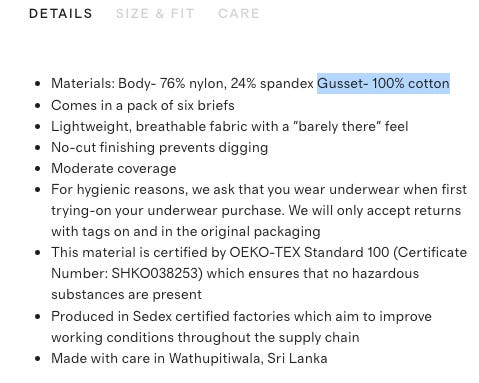 What’s it made of? Be sure to read your labels and product descriptions thoroughly so you know exactly what you’re getting. The gusset fabric is sometimes included on the underwear label and definitely should be mentioned on the product page if you’re shopping online.